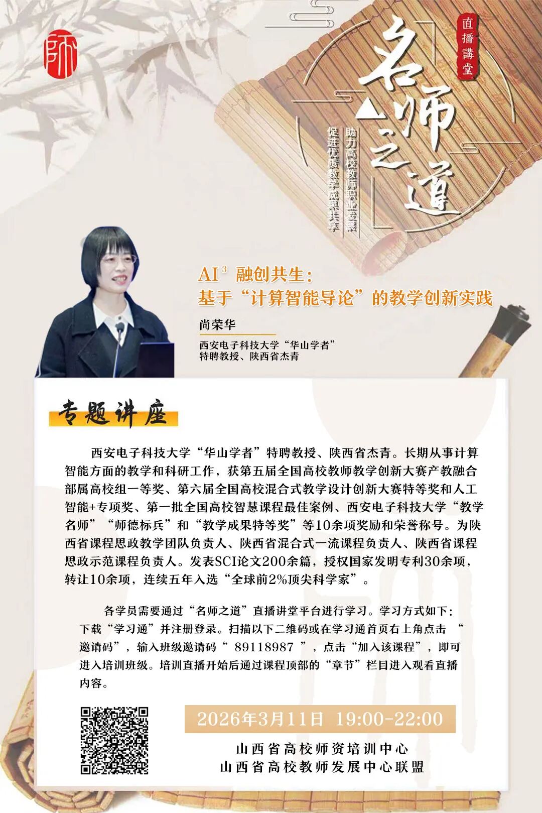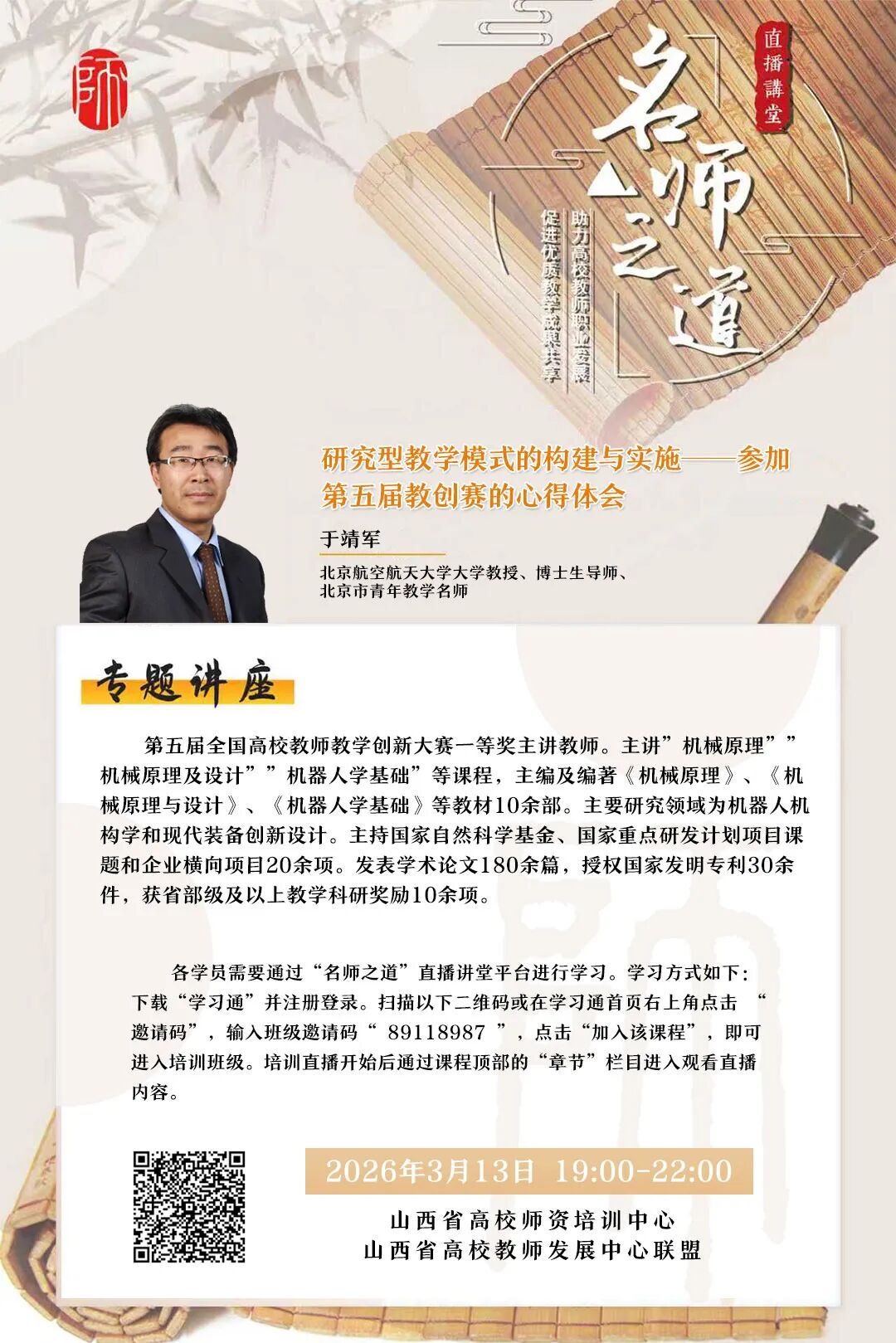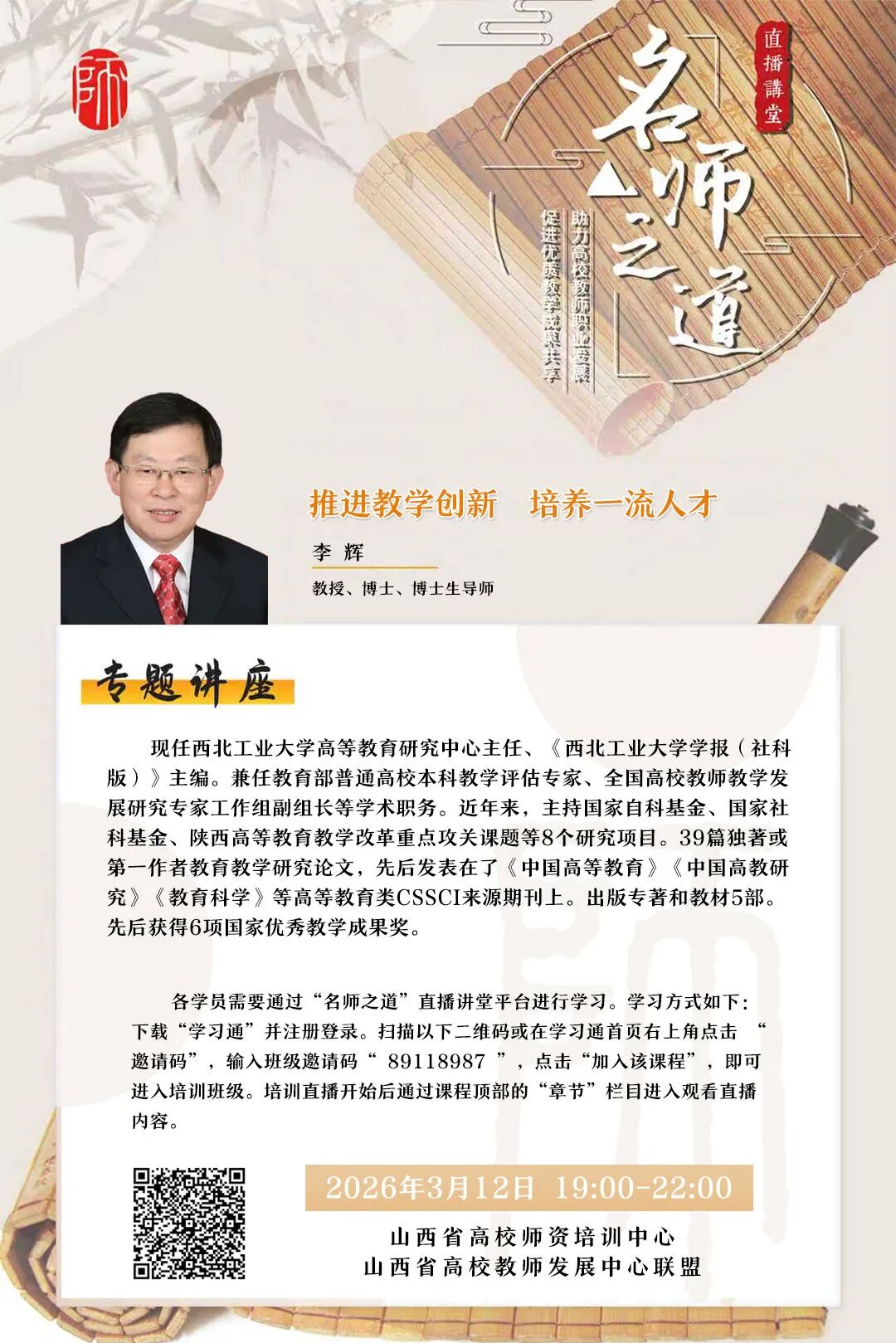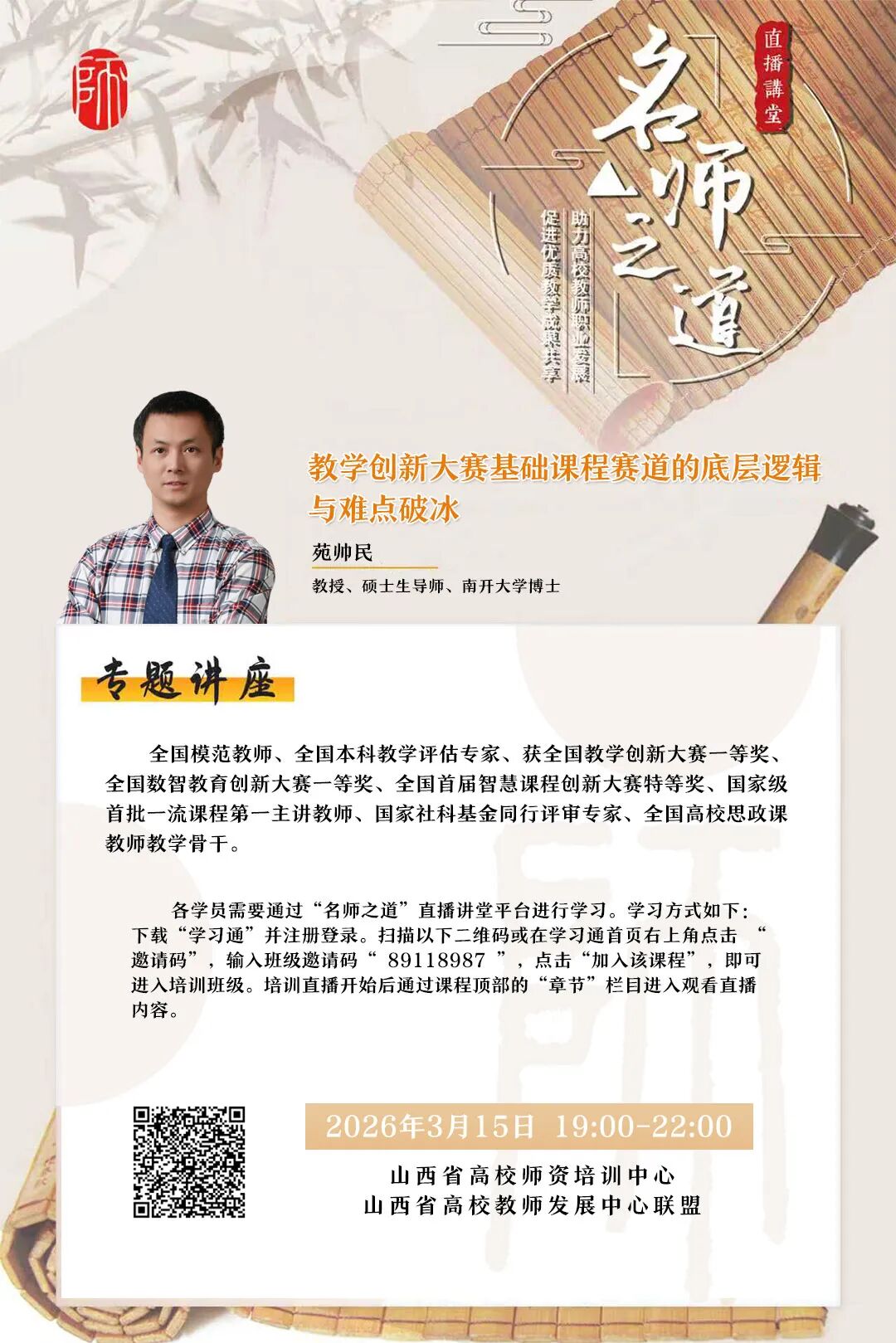 为深入学习贯彻《中共中央 国务院关于弘扬教育家精神加强新时代高素质专业化教师队伍建设的意见》文件精神,加强高素质专业化教师队伍建设,弘扬教育家精神,提升教书育人能力,深化教师队伍改革创新,山西省高校师资培训中心、山西省高校教师发展中心联盟决定继续举办“名师之道”直播讲堂系列讲座,现将有关事项通知如下: