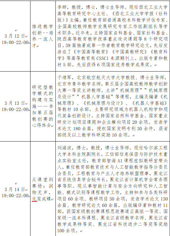 此次“名师之道”直播讲堂系列讲座为高校教师教学创新大赛专题,共安排五次线上讲座,分别为产教融合赛道、专家解读、新工科赛道、课程思政赛道、基础课程赛道。